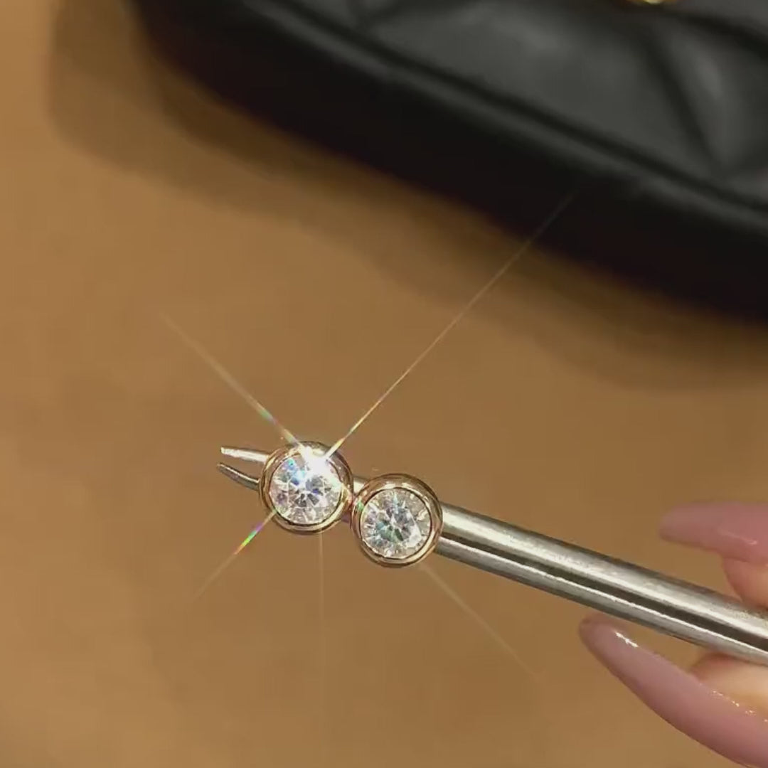 The Delphine Bezel Studs are the essence of quiet sophistication. Each round moissanite is framed by a fine polished rim that enhances its natural brilliance, creating a soft halo of light with every movement. The minimalist bezel setting keeps the silhouette modern while allowing the stone to take centre stage.