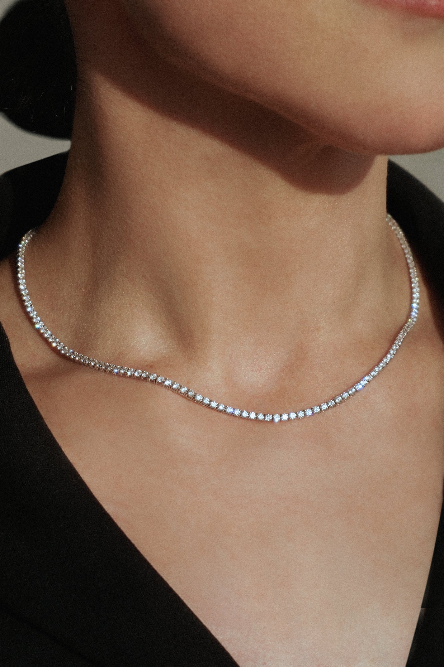 The Amiée Tennis Necklace embodies timeless radiance in its purest form. Each moissanite stone is hand-set in a seamless line, creating a continuous ribbon of light that moves effortlessly with every turn. Available in 0.10ct, 0.30ct, and 0.50ct stone sizes, it offers your perfect balance of everyday sparkle and refined sophistication.