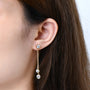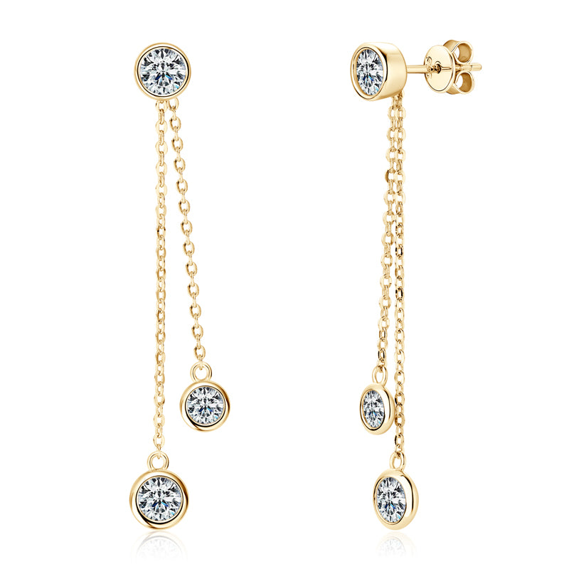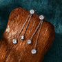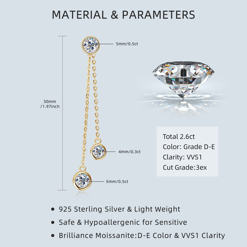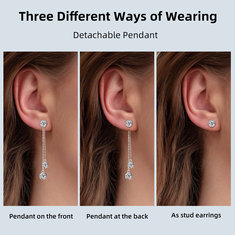 The Jade Earrings feature three brilliant moissanite stones suspended from a fine 925 sterling silver chain, designed to catch the light with every movement. With detachable drops, they can be worn three ways — as a statement dangle, a subtle back drop, or classic studs.